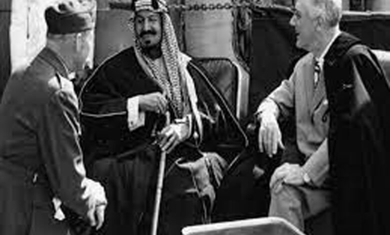 1945/2/14- الرئيس الأمريكي فرانكلين روزفلت يستقبل ملك السعودية عبد العزيز آل سعود على متن المدمرة الأمريكية «كوينزي» في البحيرات المرة في مصر، وبهذا اللقاء قاما بتدشين العلاقات الدبلوماسية بين البلدين.