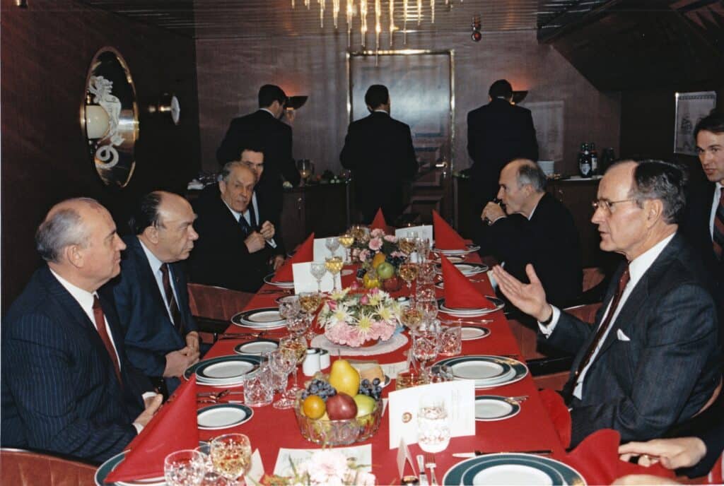 صورة أخرى بين بوش وغورباتشوف في اللقاء الذي جمعهما في ديسمبر 1989